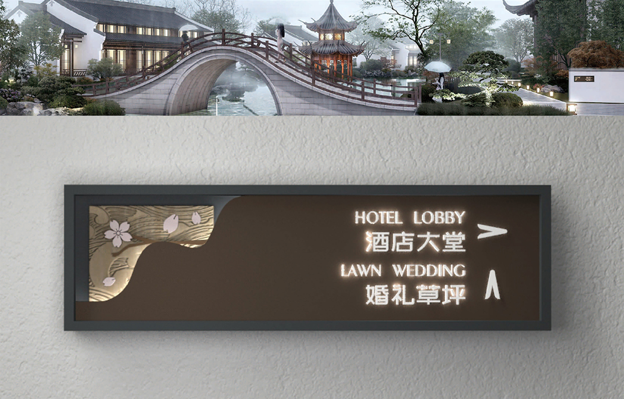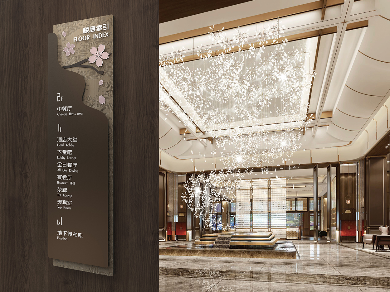 来年樱花之季,邂逅湿地之都。这里是东方湿地之都,仙鹤神鹿世界。这片有着W形状线条的水域,背后也蕴含着历史文化的遗迹。而这座度假酒店,就藏身于这片水域的樱花树丛之中。我们以樱花花瓣为灵感来源,为项目设计专属字体与箭头图标。同时以项目水域W形状线条、樱花、水纹元素为概念,进行导视设计创作。